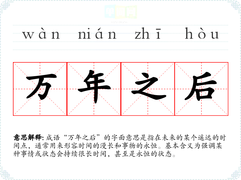 成语“万年之后”的字面意思是指在未来的某个遥远的时间点,通常用来形容时间的漫长和事物的永恒。基本含义为强调某种事情或状态会持续很长时间,甚至是永恒的状态。