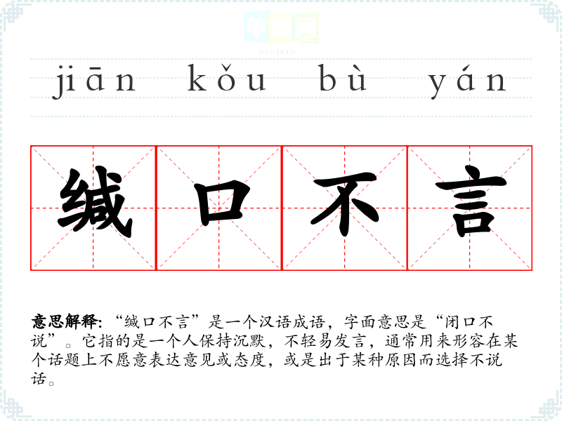 | 缄口不言 | 缄:封闭。封住嘴巴,不开口说话。 |