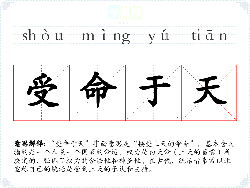 “受命于天”字面意思是“接受上天的命令”。基本含义指的是一个人或一个国家的命运、权力是由天命(上天的旨意)所决定的,强调了权力的合法性和神圣性。在古代,统治者常常以此宣称自己的统治是受到上天的承认和支持。