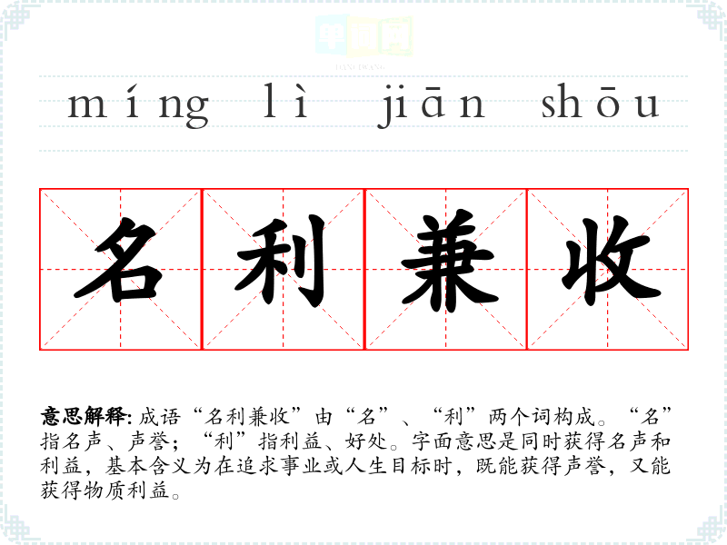 成语“名利兼收”由“名”、“利”两个词构成。“名”指名声、声誉;“利”指利益、好处。字面意思是同时获得名声和利益,基本含义为在追求事业或人生目标时,既能获得声誉,又能获得物质利益。
