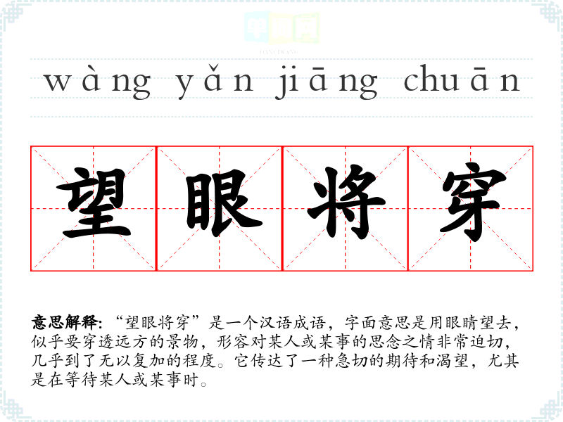 “望眼将穿”是一个汉语成语,字面意思是用眼睛望去,似乎要穿透远方的景物,形容对某人或某事的思念之情非常迫切,几乎到了无以复加的程度。它传达了一种急切的期待和渴望,尤其是在等待某人或某事时。
