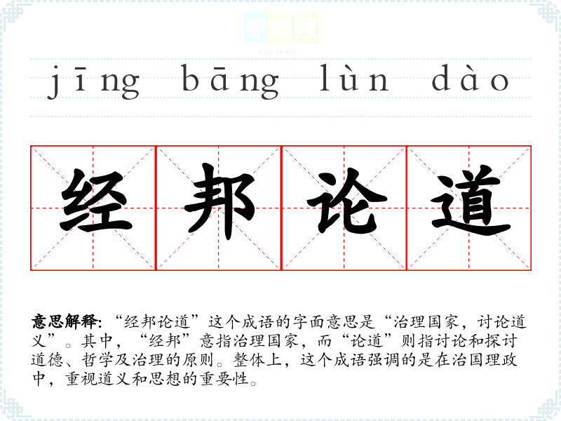 “经邦论道”这个成语的字面意思是“治理国家,讨论道义”。其中,“经邦”意指治理国家,而“论道”则指讨论和探讨道德、哲学及治理的原则。整体上,这个成语强调的是在治国理政中,重视道义和思想的重要性。