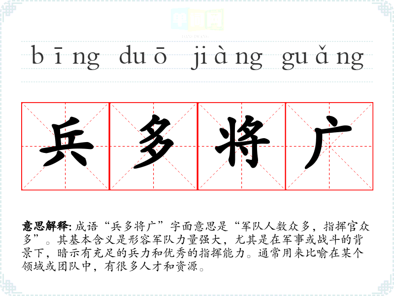 成语“兵多将广”字面意思是“军队人数众多,指挥官众多”。其基本含义是形容军队力量强大,尤其是在军事或战斗的背景下,暗示有充足的兵力和优秀的指挥能力。通常用来比喻在某个领域或团队中,有很多人才和资源。