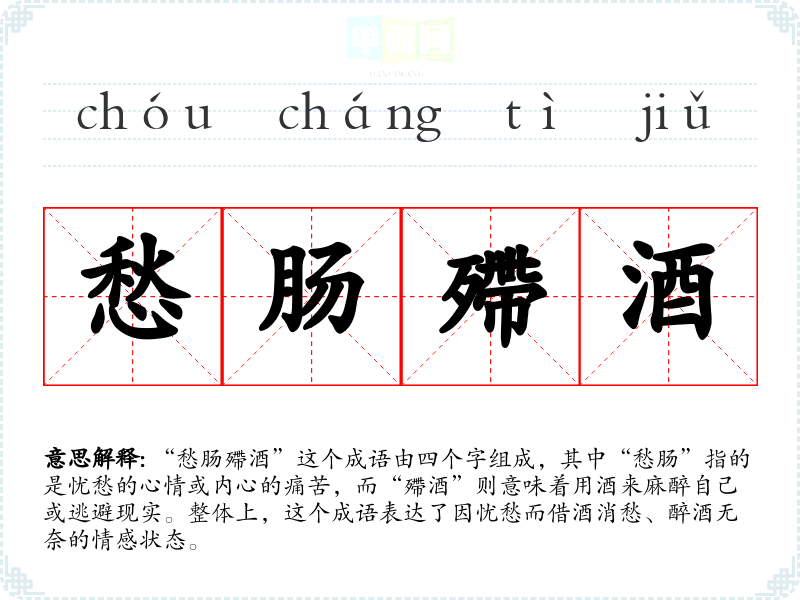 “愁肠殢酒”这个成语由四个字组成,其中“愁肠”指的是忧愁的心情或内心的痛苦,而“殢酒”则意味着用酒来麻醉自己或逃避现实。整体上,这个成语表达了因忧愁而借酒消愁、醉酒无奈的情感状态。