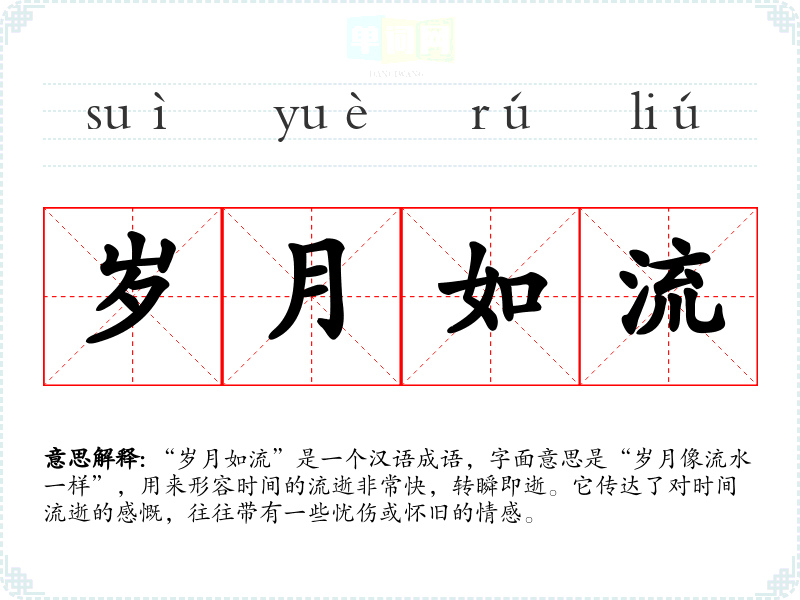 “岁月如流”是一个汉语成语,字面意思是“岁月像流水一样”,用来形容时间的流逝非常快,转瞬即逝。它传达了对时间流逝的感慨,往往带有一些忧伤或怀旧的情感。