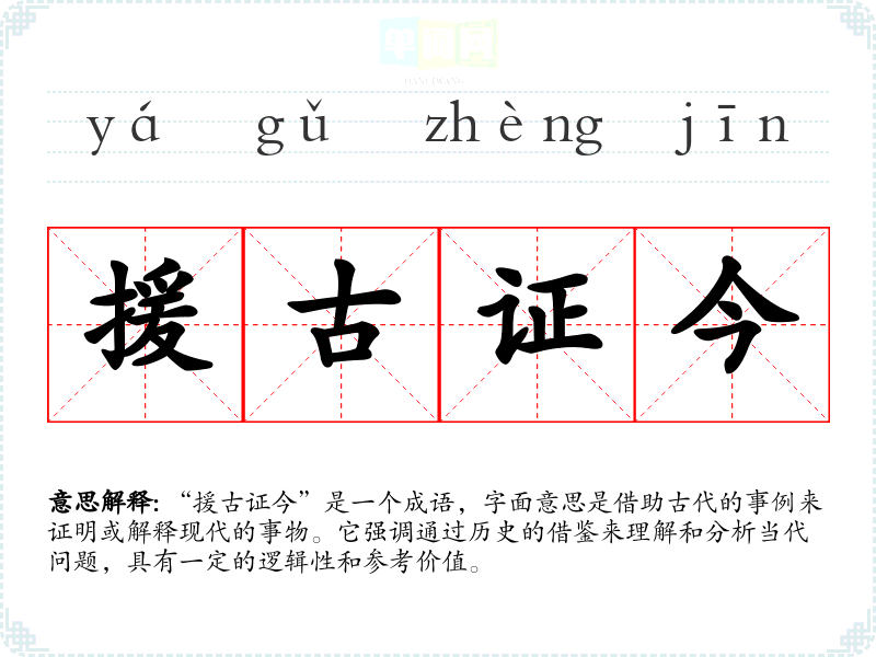 “援古证今”是一个成语,字面意思是借助古代的事例来证明或解释现代的事物。它强调通过历史的借鉴来理解和分析当代问题,具有一定的逻辑性和参考价值。