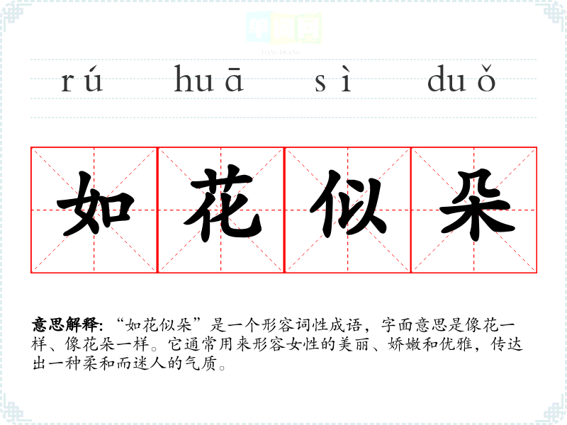 “如花似朵”是一个形容词性成语,字面意思是像花一样、像花朵一样。它通常用来形容女性的美丽、娇嫩和优雅,传达出一种柔和而迷人的气质。