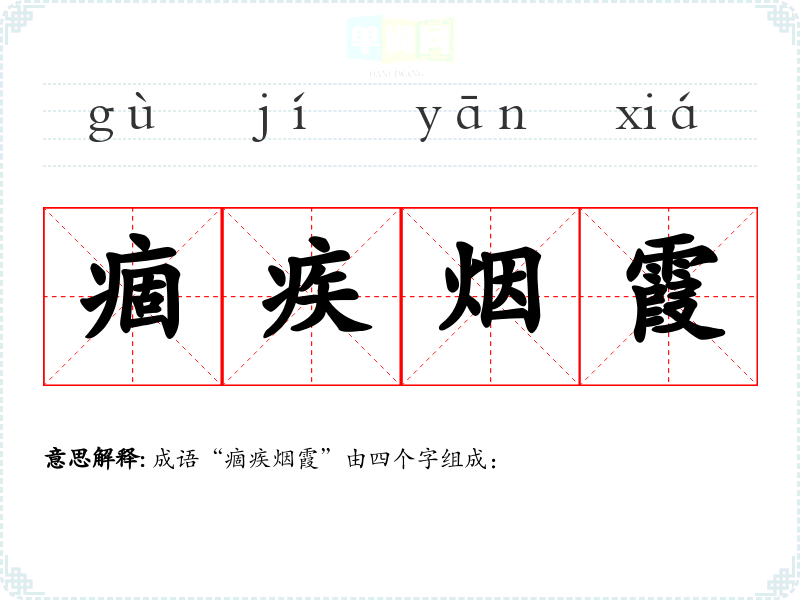 | 泉石膏肓,烟霞痼疾 | 膏肓:病情严重;痼疾:久治不愈的病。形容爱好山水林泉,烟雾云霞,已经成为难以改变的癖好。 |
