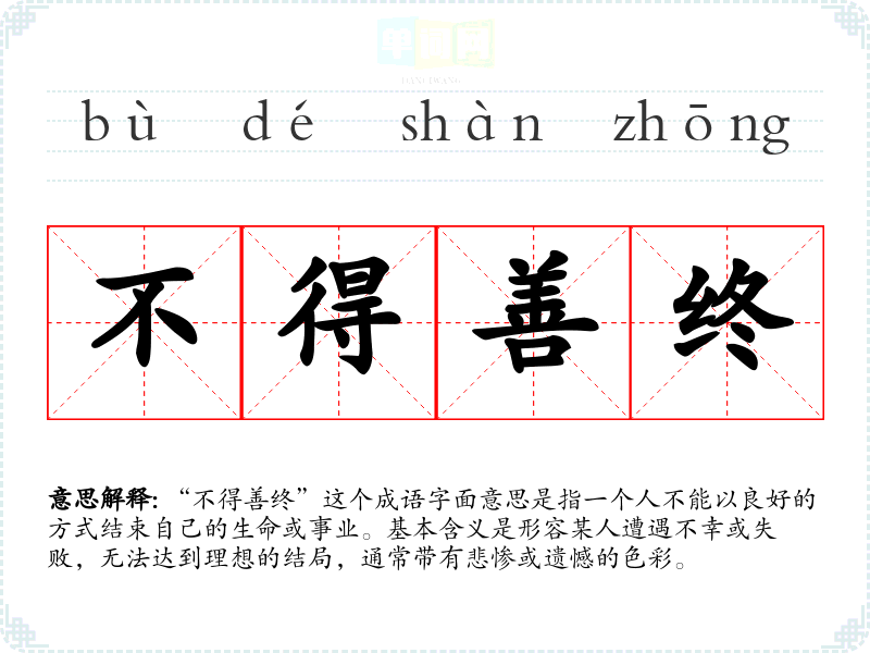 “不得善终”这个成语字面意思是指一个人不能以良好的方式结束自己的生命或事业。基本含义是形容某人遭遇不幸或失败,无法达到理想的结局,通常带有悲惨或遗憾的色彩。