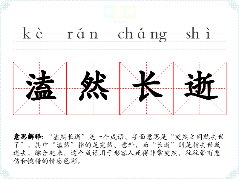 “溘然长逝”是一个成语,字面意思是“突然之间就去世了”。其中“溘然”指的是突然、意外,而“长逝”则是指去世或逝去。综合起来,这个成语用于形容人死得非常突然,往往带有悲伤和惋惜的情感色彩。