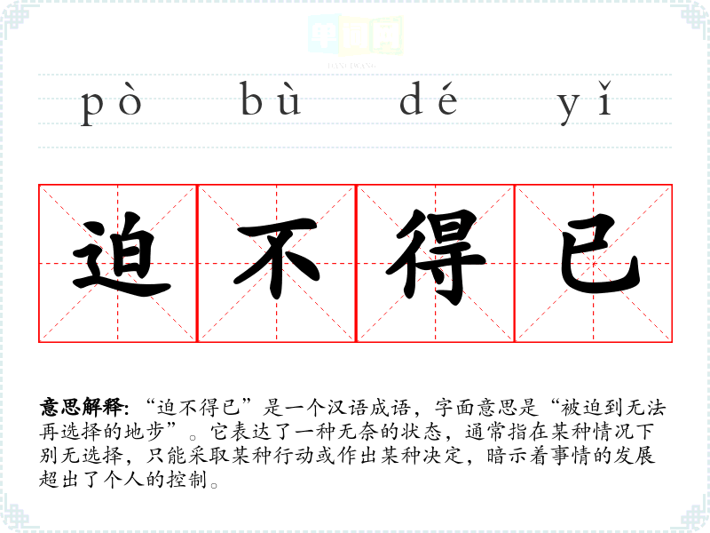 “迫不得已”是一个汉语成语,字面意思是“被迫到无法再选择的地步”。它表达了一种无奈的状态,通常指在某种情况下别无选择,只能采取某种行动或作出某种决定,暗示着事情的发展超出了个人的控制。