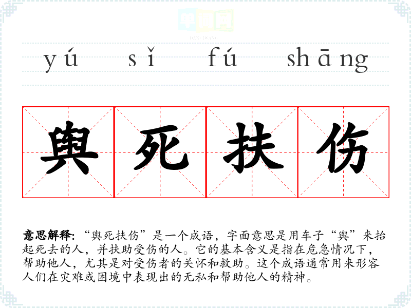 “舆死扶伤”是一个成语,字面意思是用车子“舆”来抬起死去的人,并扶助受伤的人。它的基本含义是指在危急情况下,帮助他人,尤其是对受伤者的关怀和救助。这个成语通常用来形容人们在灾难或困境中表现出的无私和帮助他人的精神。