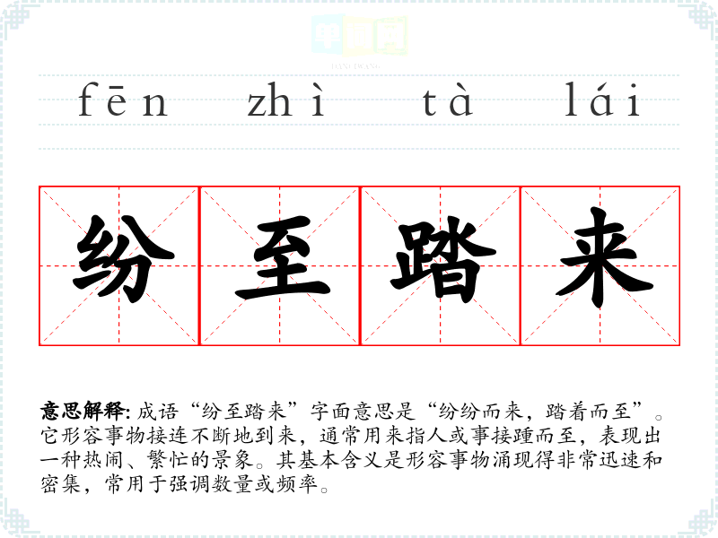 成语“纷至踏来”字面意思是“纷纷而来,踏着而至”。它形容事物接连不断地到来,通常用来指人或事接踵而至,表现出一种热闹、繁忙的景象。其基本含义是形容事物涌现得非常迅速和密集,常用于强调数量或频率。