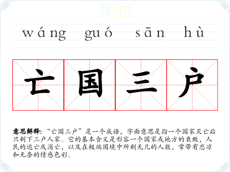 “亡国三户”是一个成语,字面意思是指一个国家灭亡后只剩下三户人家。它的基本含义是形容一个国家或地方的衰败,人民的逃亡或消亡,以及在极端困境中所剩无几的人数,常带有悲凉和无奈的情感色彩。