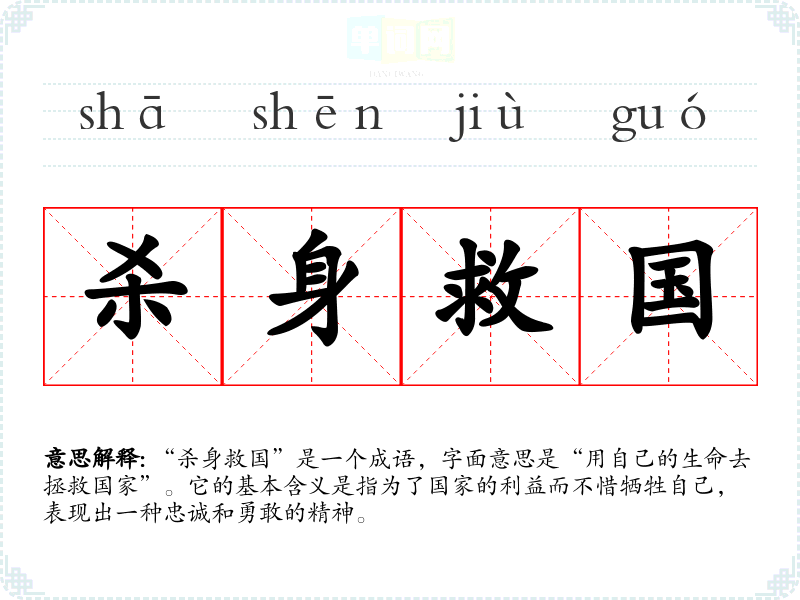 “杀身救国”是一个成语,字面意思是“用自己的生命去拯救国家”。它的基本含义是指为了国家的利益而不惜牺牲自己,表现出一种忠诚和勇敢的精神。
