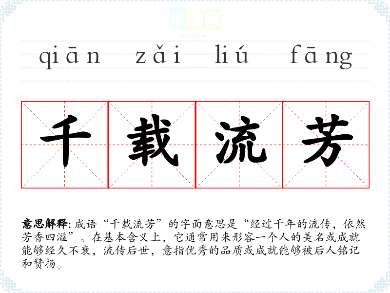 成语“千载流芳”的字面意思是“经过千年的流传,依然芳香四溢”。在基本含义上,它通常用来形容一个人的美名或成就能够经久不衰,流传后世,意指优秀的品质或成就能够被后人铭记和赞扬。