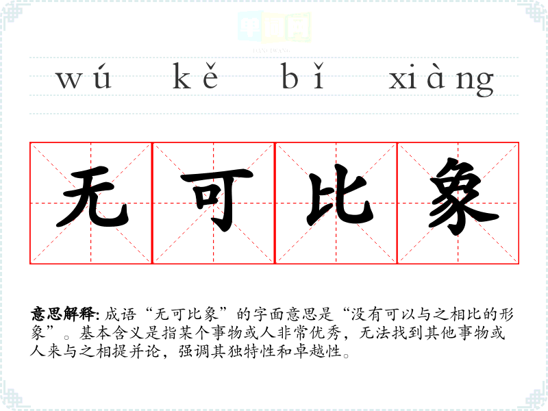 成语“无可比象”的字面意思是“没有可以与之相比的形象”。基本含义是指某个事物或人非常优秀,无法找到其他事物或人来与之相提并论,强调其独特性和卓越性。