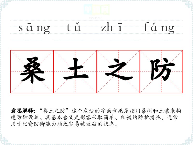 “桑土之防”这个成语的字面意思是指用桑树和土壤来构建防御设施。其基本含义是形容采取简单、粗糙的防护措施,通常用于比喻防御能力弱或容易被攻破的状态。