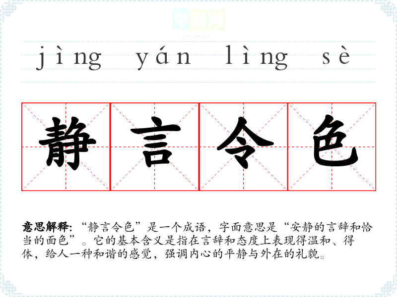 “静言令色”是一个成语,字面意思是“安静的言辞和恰当的面色”。它的基本含义是指在言辞和态度上表现得温和、得体,给人一种和谐的感觉,强调内心的平静与外在的礼貌。
