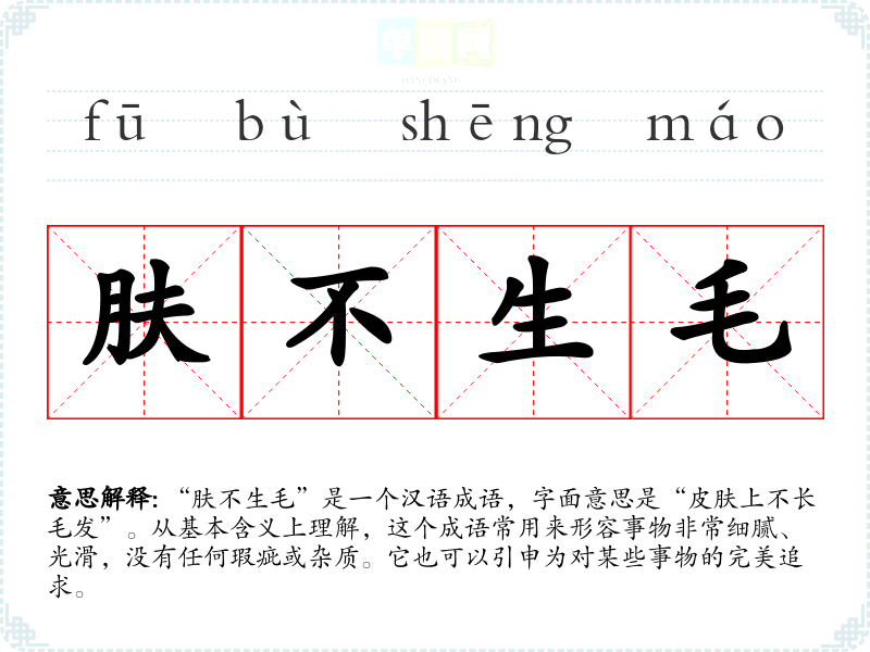 在中国文化中,传统上对皮肤的审美有着特定的标准,尤其是女性的皮肤被视为美丽的重要因素之一。因此,“肤不生毛”作为一个成语,体现了对美的独特追求。在现代社会,这一成语依然能够用来形容对高品质生活的追求。