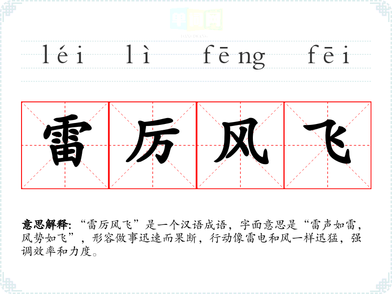 “雷厉风飞”是一个汉语成语,字面意思是“雷声如雷,风势如飞”,形容做事迅速而果断,行动像雷电和风一样迅猛,强调效率和力度。