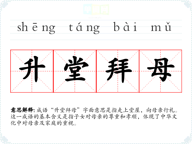 成语“升堂拜母”字面意思是指走上堂屋,向母亲行礼。这一成语的基本含义是指子女对母亲的尊重和孝顺,体现了中华文化中对母亲及家庭的重视。