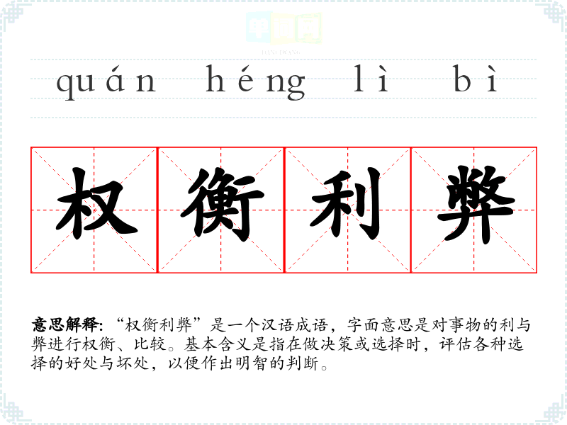 “权衡利弊”是一个汉语成语,字面意思是对事物的利与弊进行权衡、比较。基本含义是指在做决策或选择时,评估各种选择的好处与坏处,以便作出明智的判断。