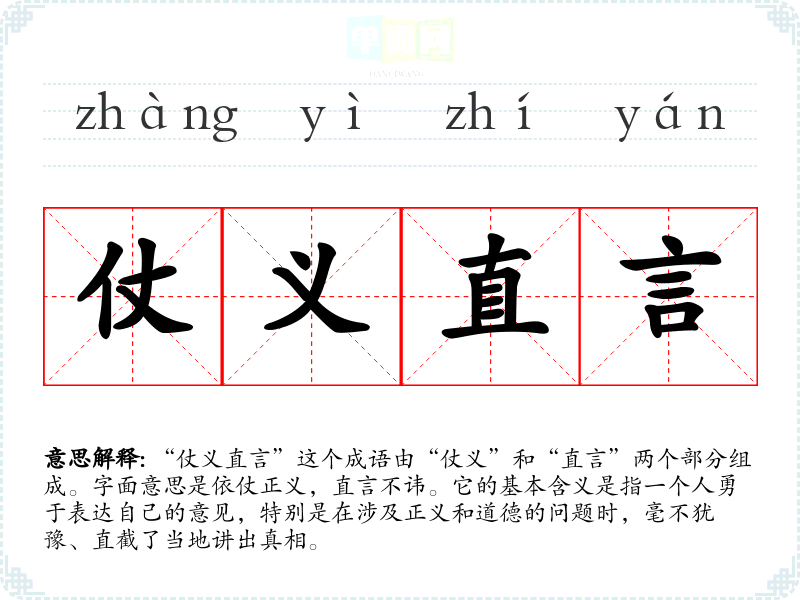“仗义直言”这个成语由“仗义”和“直言”两个部分组成。字面意思是依仗正义,直言不讳。它的基本含义是指一个人勇于表达自己的意见,特别是在涉及正义和道德的问题时,毫不犹豫、直截了当地讲出真相。