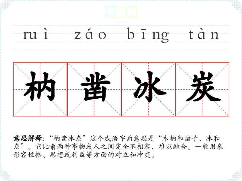 “枘凿冰炭”这个成语字面意思是“木枘和凿子、冰和炭”。它比喻两种事物或人之间完全不相容,难以融合。一般用来形容性格、思想或利益等方面的对立和冲突。