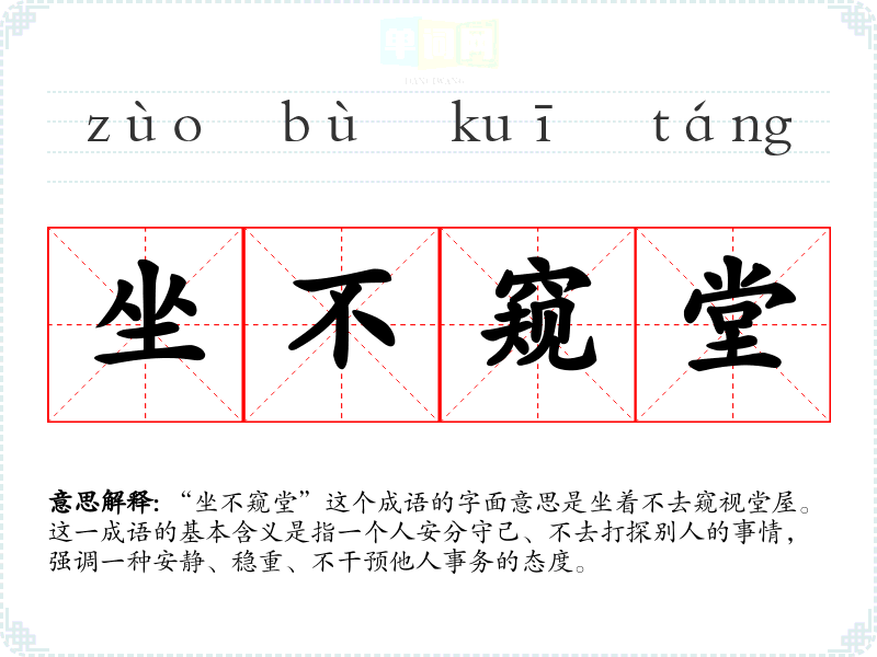 “坐不窥堂”这个成语的字面意思是坐着不去窥视堂屋。这一成语的基本含义是指一个人安分守己、不去打探别人的事情,强调一种安静、稳重、不干预他人事务的态度。