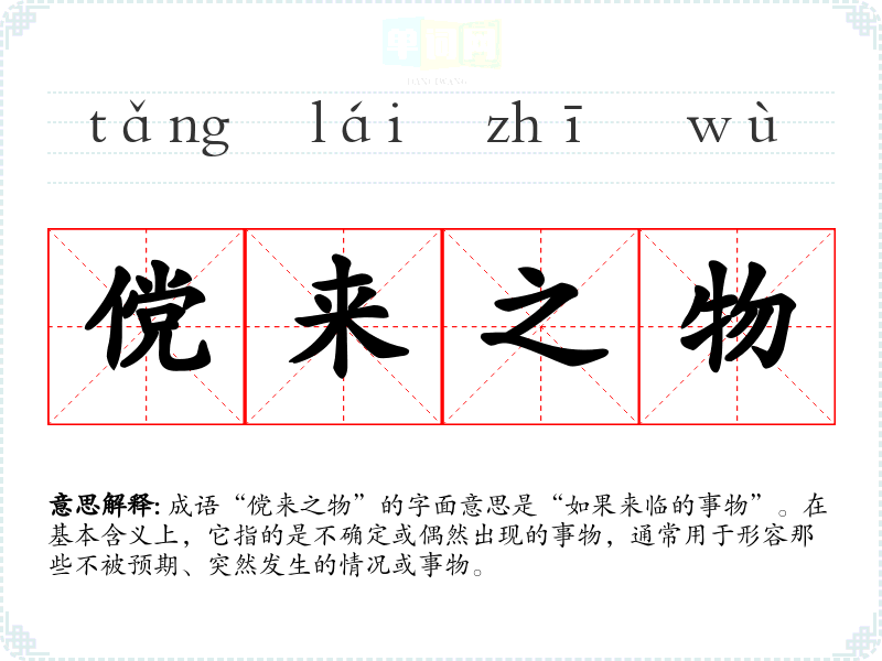成语“傥来之物”的字面意思是“如果来临的事物”。在基本含义上,它指的是不确定或偶然出现的事物,通常用于形容那些不被预期、突然发生的情况或事物。