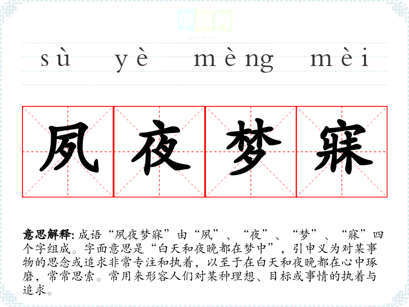 成语“夙夜梦寐”由“夙”、“夜”、“梦”、“寐”四个字组成。字面意思是“白天和夜晚都在梦中”,引申义为对某事物的思念或追求非常专注和执着,以至于在白天和夜晚都在心中琢磨,常常思索。常用来形容人们对某种理想、目标或事情的执着与追求。