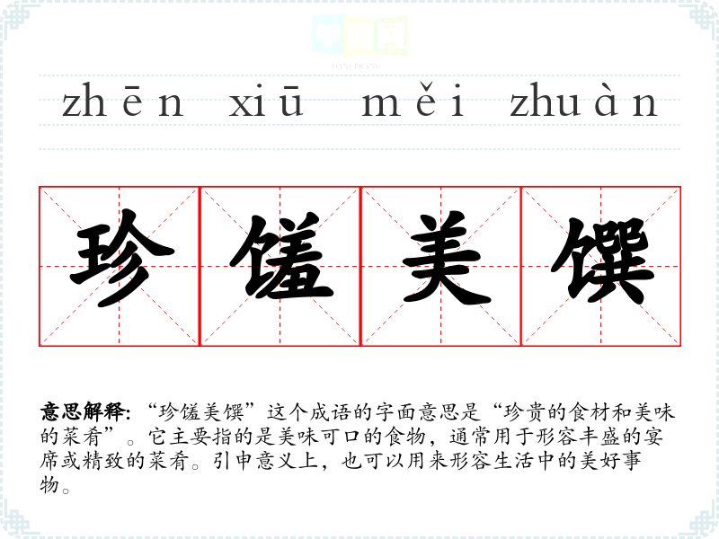 “珍馐美馔”让我联想到家庭团聚的温馨时刻,那种围坐一起享受美食的幸福感。它不仅仅是对食物的赞美,更是对生活品质的追求,反映了人们对美好生活的向往。
