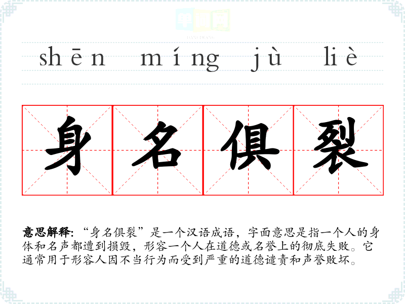 “身名俱裂”出自古代文献,具体的出处虽不详,但其字面构成中“身”指身体,“名”指名声,而“俱裂”则是指一起破裂或受到损害。这个成语的形成反映了传统文化中对个人名声和道德的重视。