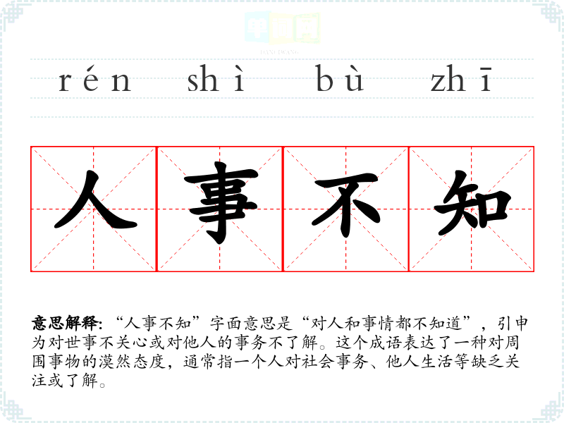 “人事不知”字面意思是“对人和事情都不知道”,引申为对世事不关心或对他人的事务不了解。这个成语表达了一种对周围事物的漠然态度,通常指一个人对社会事务、他人生活等缺乏关注或了解。