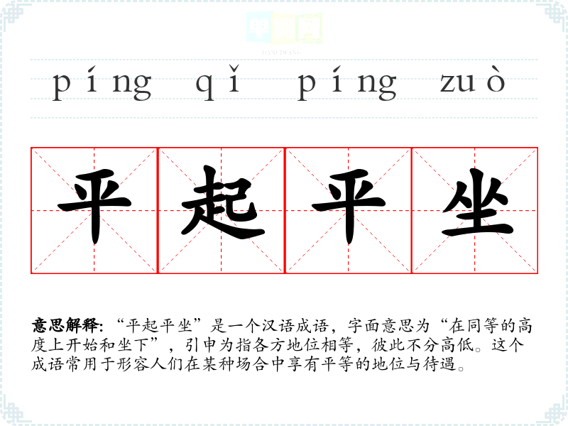 “平起平坐”是一个汉语成语,字面意思为“在同等的高度上开始和坐下”,引申为指各方地位相等,彼此不分高低。这个成语常用于形容人们在某种场合中享有平等的地位与待遇。