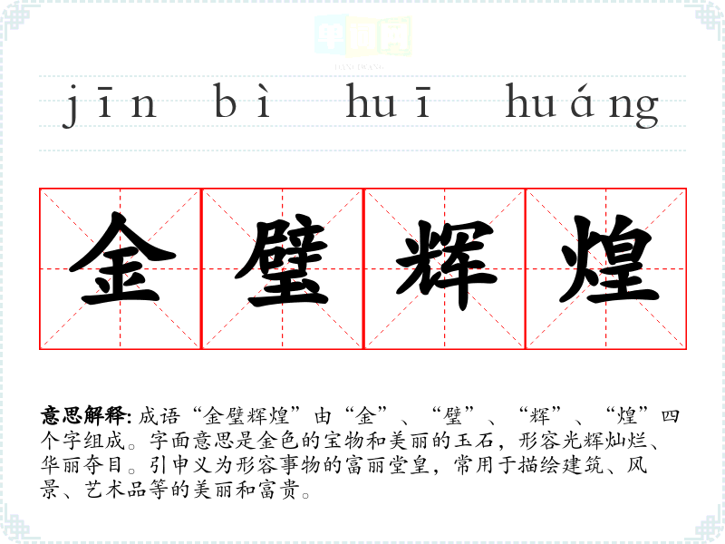 成语“金璧辉煌”由“金”、“璧”、“辉”、“煌”四个字组成。字面意思是金色的宝物和美丽的玉石,形容光辉灿烂、华丽夺目。引申义为形容事物的富丽堂皇,常用于描绘建筑、风景、艺术品等的美丽和富贵。