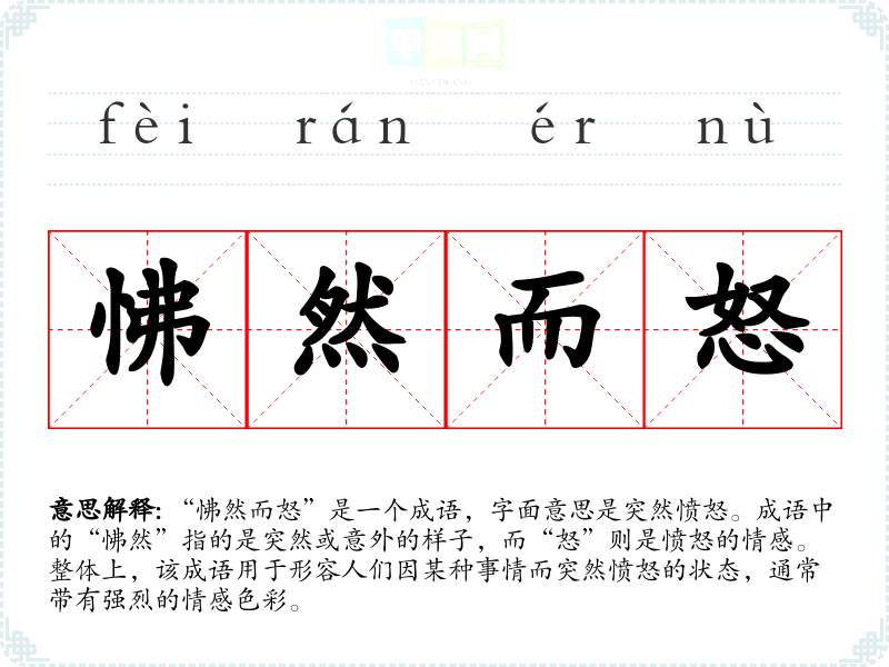 “怫然而怒”是一个成语,字面意思是突然愤怒。成语中的“怫然”指的是突然或意外的样子,而“怒”则是愤怒的情感。整体上,该成语用于形容人们因某种事情而突然愤怒的状态,通常带有强烈的情感色彩。