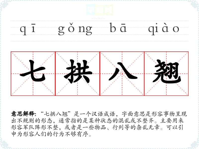 “七拱八翘”是一个汉语成语,字面意思是形容事物呈现出不规则的形态,通常指的是某种状态的混乱或不整齐。主要用来形容军队阵形不整,或者是一些物品、行列等的杂乱无章。可以引申为形容人们的行为不够有序。