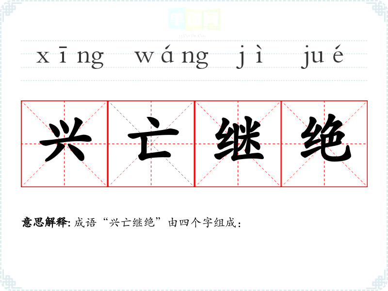 字面意思是指一个国家或事物的兴起与灭亡,强调在兴亡之间的继承与延续。基本含义是强调历史的循环,兴起与灭亡相互交替,继承过去的经验与教训以推动未来的发展。