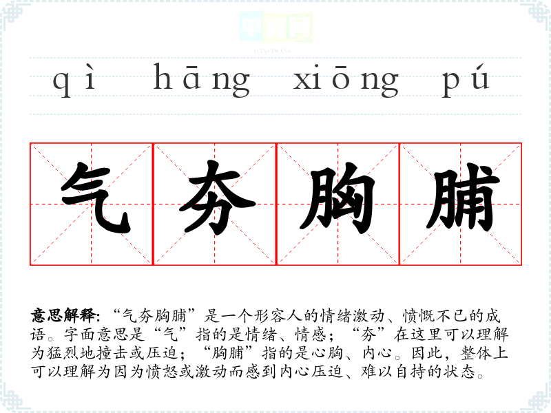 “气夯胸脯”来源于古代文人对情感的观察与表达,虽然具体的历史文献较少,但类似的表达在古典文学中常见,反映了古人对内心情感冲突的细腻描绘。古代诗词中常常会有描述愤怒、激动情绪的字句,这种成语的形成与古代人对情感的重视密切相关。