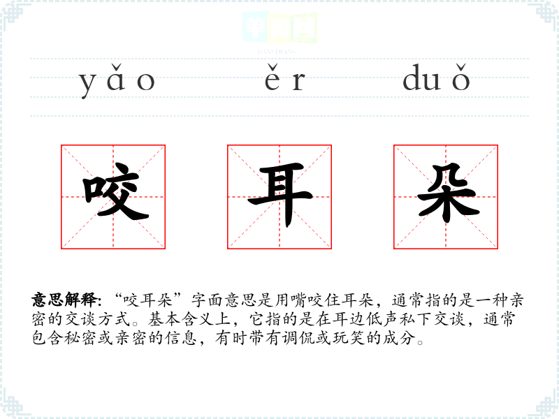 “咬耳朵”字面意思是用嘴咬住耳朵,通常指的是一种亲密的交谈方式。基本含义上,它指的是在耳边低声私下交谈,通常包含秘密或亲密的信息,有时带有调侃或玩笑的成分。