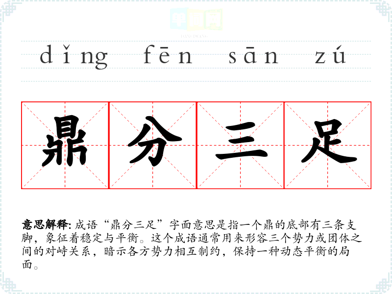 成语“鼎分三足”字面意思是指一个鼎的底部有三条支脚,象征着稳定与平衡。这个成语通常用来形容三个势力或团体之间的对峙关系,暗示各方势力相互制约,保持一种动态平衡的局面。