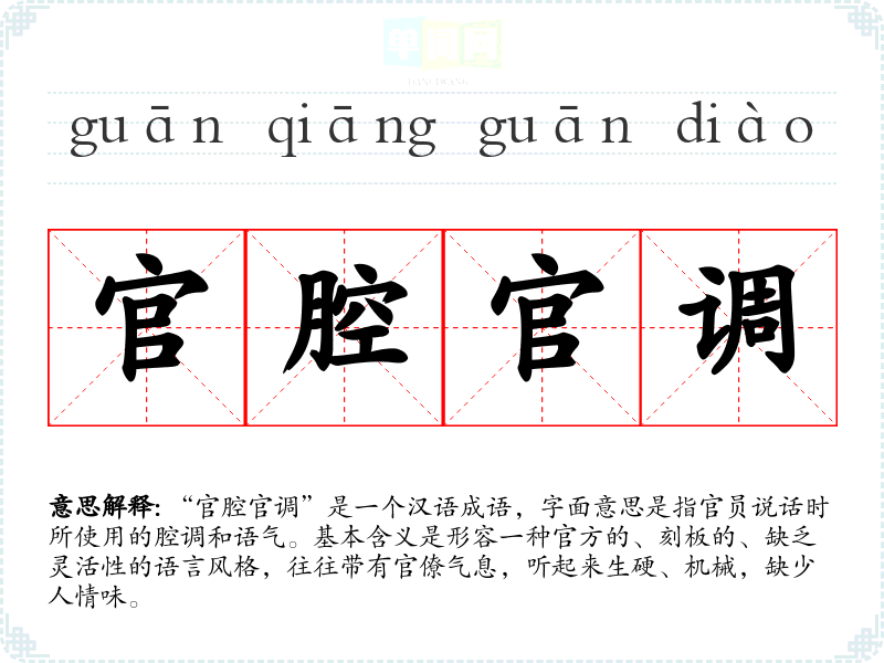 “官腔官调”是一个汉语成语,字面意思是指官员说话时所使用的腔调和语气。基本含义是形容一种官方的、刻板的、缺乏灵活性的语言风格,往往带有官僚气息,听起来生硬、机械,缺少人情味。
