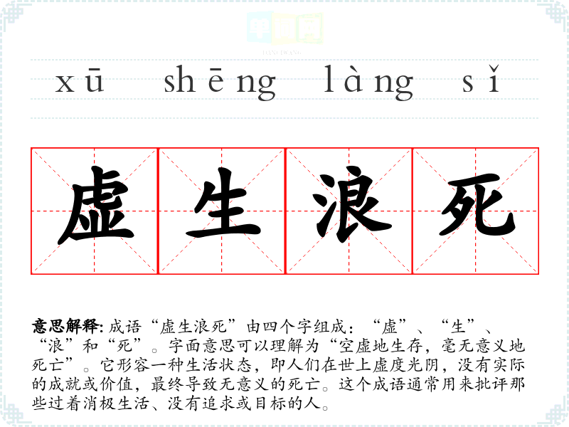 成语“虚生浪死”由四个字组成:“虚”、“生”、“浪”和“死”。字面意思可以理解为“空虚地生存,毫无意义地死亡”。它形容一种生活状态,即人们在世上虚度光阴,没有实际的成就或价值,最终导致无意义的死亡。这个成语通常用来批评那些过着消极生活、没有追求或目标的人。