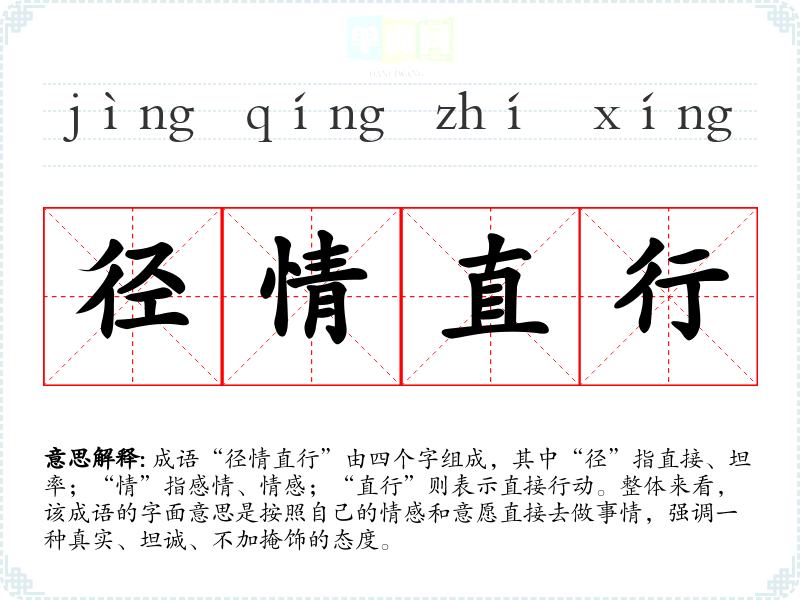 成语“径情直行”由四个字组成,其中“径”指直接、坦率;“情”指感情、情感;“直行”则表示直接行动。整体来看,该成语的字面意思是按照自己的情感和意愿直接去做事情,强调一种真实、坦诚、不加掩饰的态度。