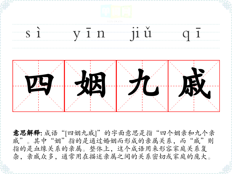 成语“[四姻九戚]”的字面意思是指“四个姻亲和九个亲戚”。其中“姻”指的是通过婚姻而形成的亲属关系,而“戚”则指的是血缘关系的亲属。整体上,这个成语用来形容家庭关系复杂,亲戚众多,通常用在描述亲属之间的关系密切或家庭的庞大。