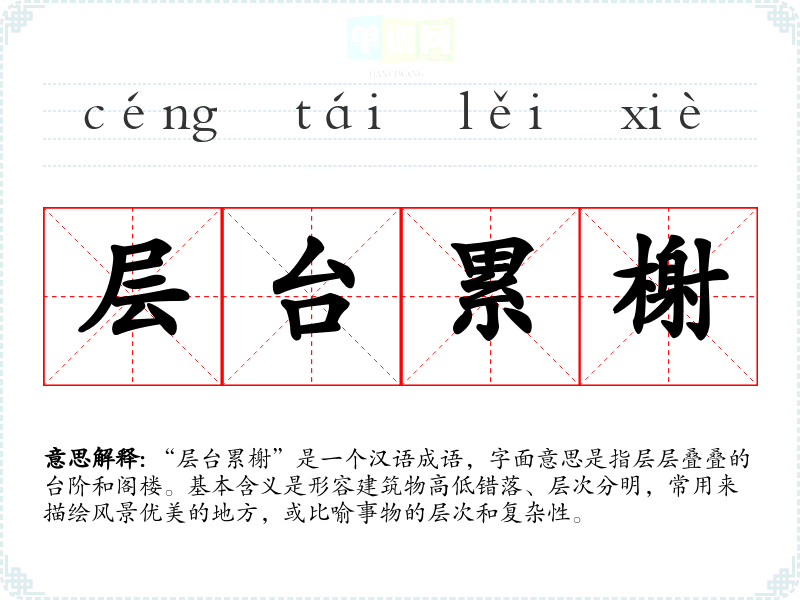 “层台累榭”是一个汉语成语,字面意思是指层层叠叠的台阶和阁楼。基本含义是形容建筑物高低错落、层次分明,常用来描绘风景优美的地方,或比喻事物的层次和复杂性。