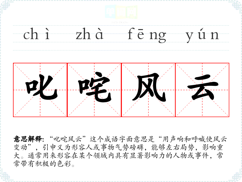 | 风云叱咤 | 叱咤:发怒吆喝。一声呼喊、怒喝,可以使风云变色。形容声势威力极大。 |
