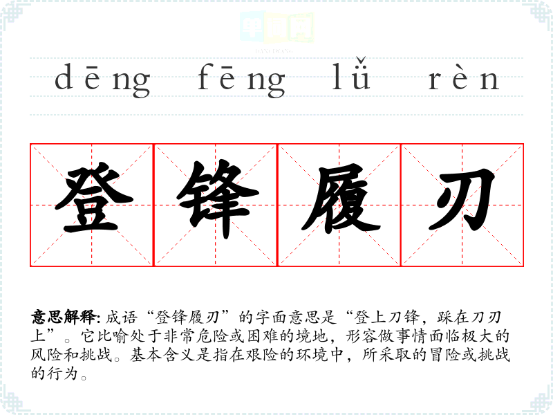 成语“登锋履刃”的字面意思是“登上刀锋,踩在刀刃上”。它比喻处于非常危险或困难的境地,形容做事情面临极大的风险和挑战。基本含义是指在艰险的环境中,所采取的冒险或挑战的行为。